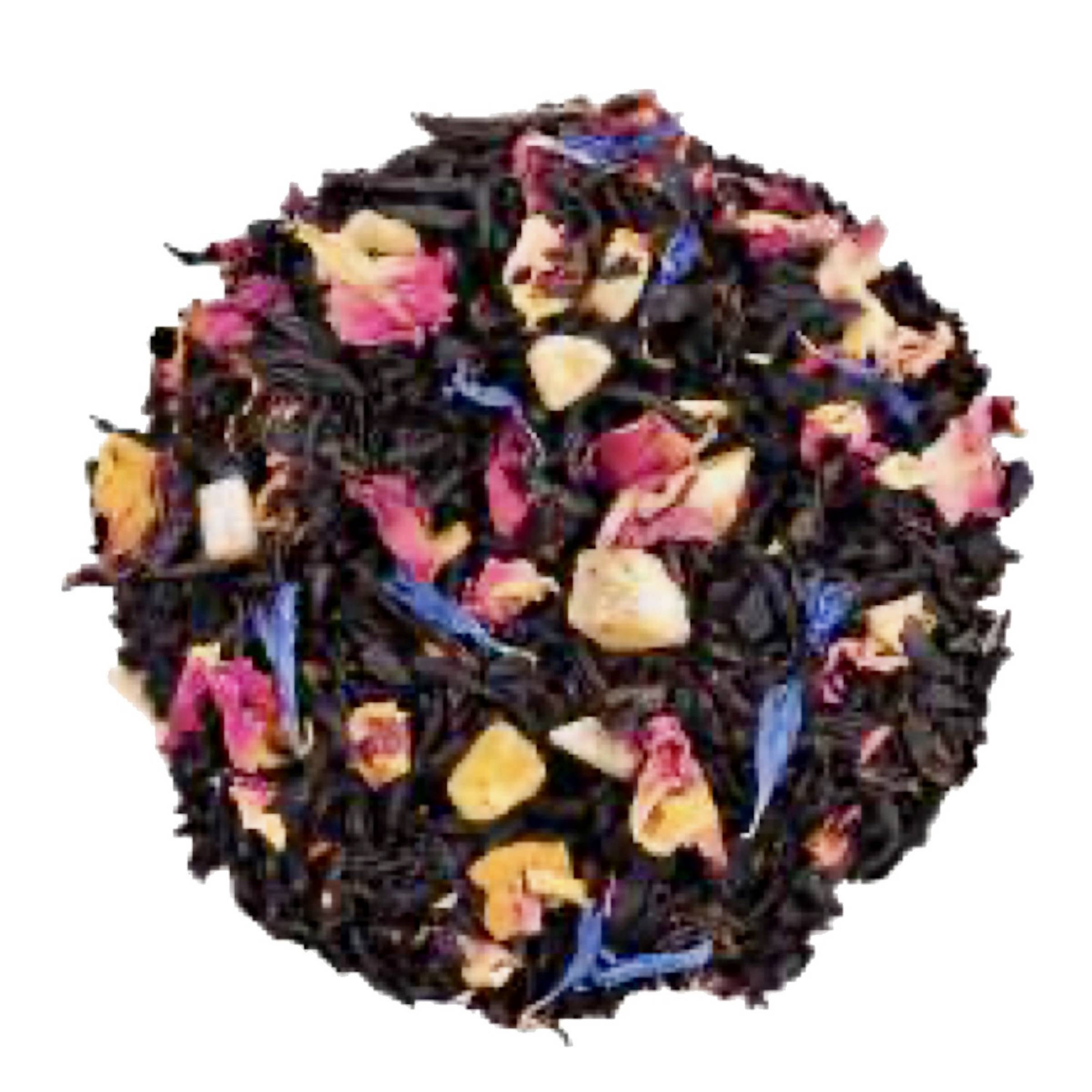 Saveur Mangue-Rose Ingrédients: Thé noir Ceylan, Inde du Sud, Chine Ananas (ananas, sucre) Papaye (papaye, sucre) Raisin (raisin, huile végétale) Pétales de rose (7%) Arôme naturel Fleurs de bleuet Fleurs d’hibiscus Description: Ce mélange de thé noir avec des fruits tropicaux et des fleurs offre une expérience gustative exotique tout en apportant des antioxydants, des vitamines et des fibres. Thé noir: Riche en antioxydants, tels que les flavonoïdes, qui peuvent contribuer à la santé cardiovasculaire, à la santé cognitive et à la réduction du risque de certains cancers. Fruits: Fournissent des enzymes digestives naturelles, comme la bromélaïne dans l'ananas et la papaïne dans la papaye, qui peuvent aider à faciliter la digestion. Pétales de roses et fleurs de bleuets: Outre leur attrait visuel et leur contribution à l'arôme du thé, elles fournissent des antioxydants bénéfiques pour la santé et contribuent à réduire l'inflammation. Fleurs d’hibiscus: Riches en antioxydants et ayant des effets bénéfiques sur la santé cardiovasculaire. Elles ajoutent à notre thé rafraîchissant un parfum de fruits rouges.